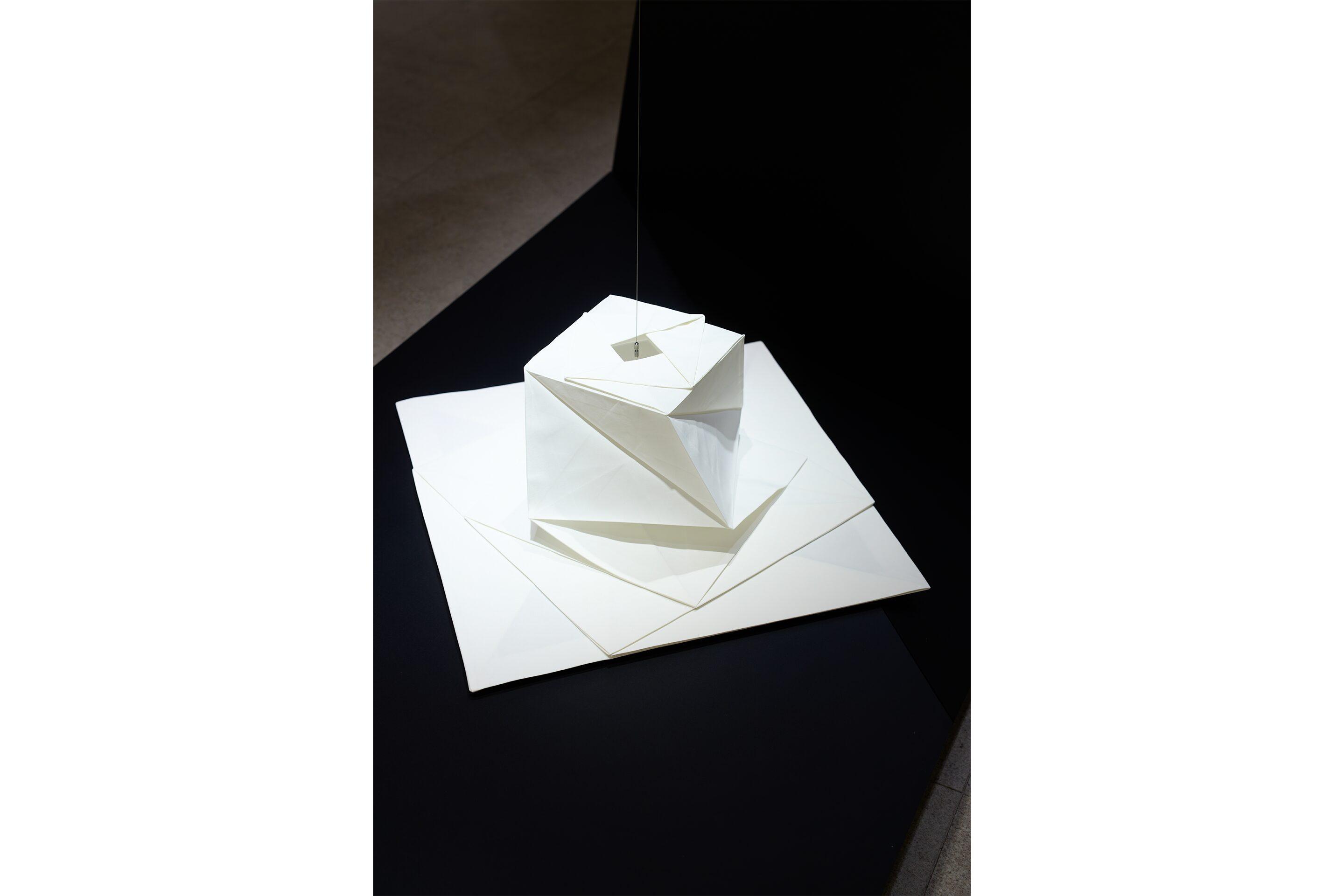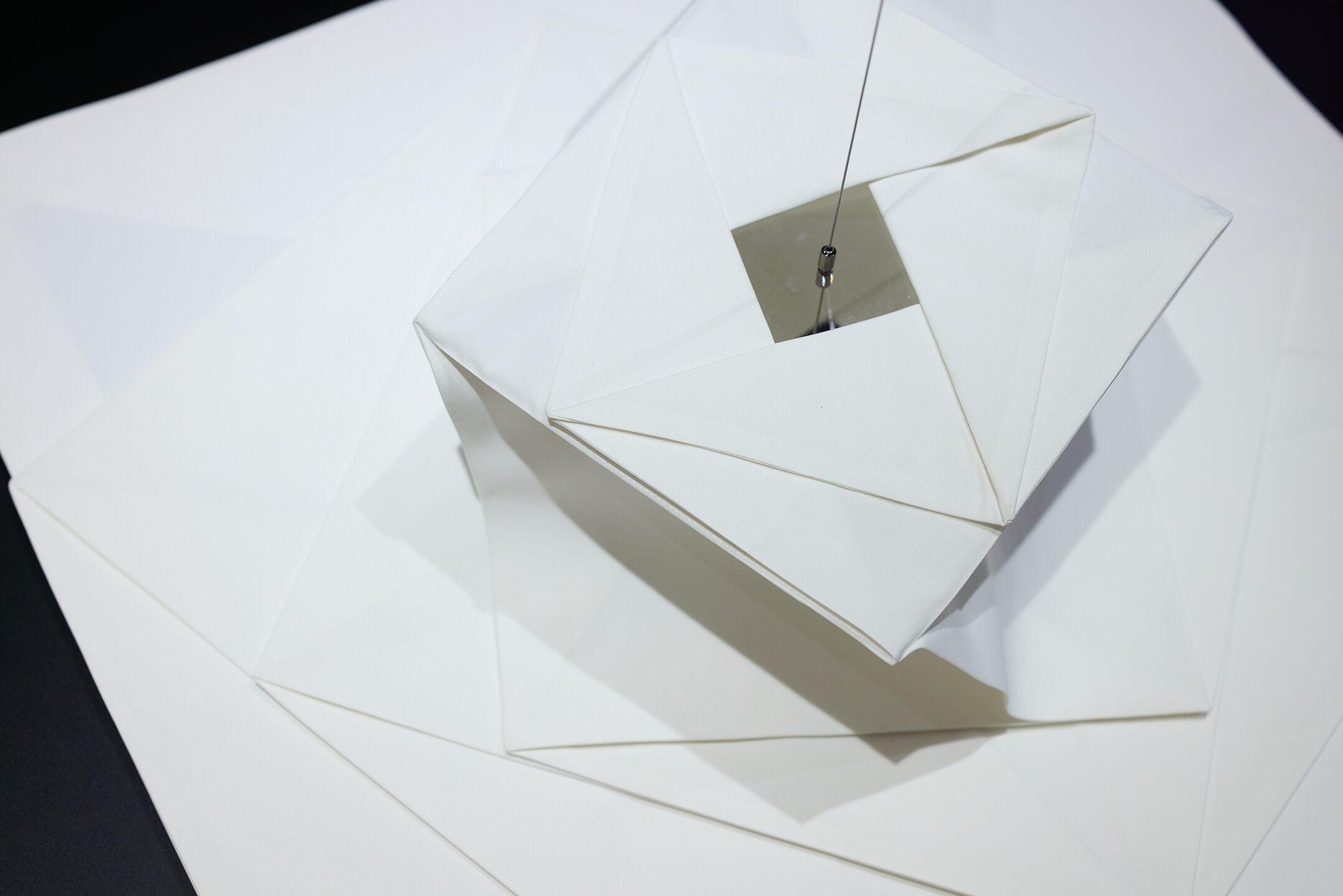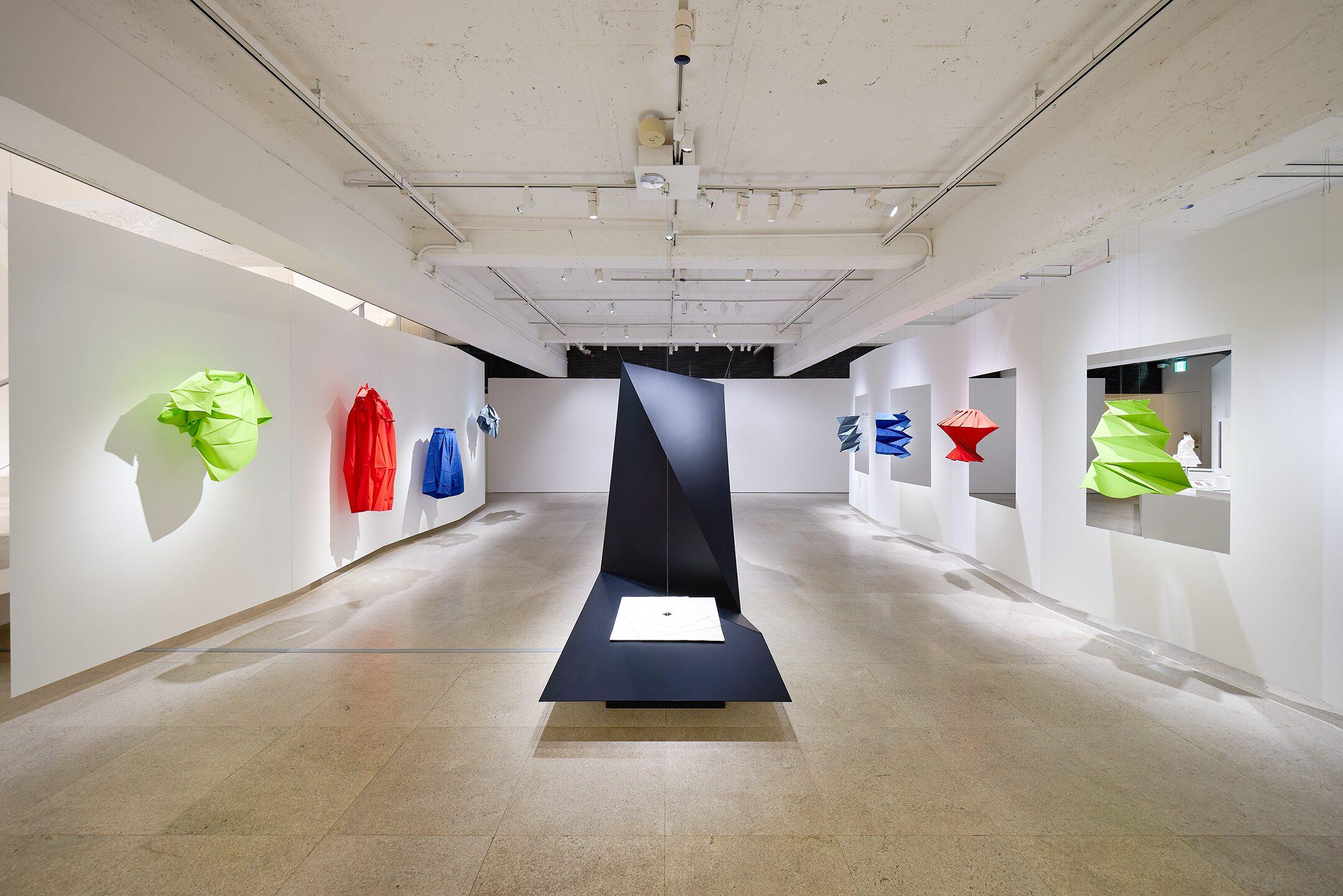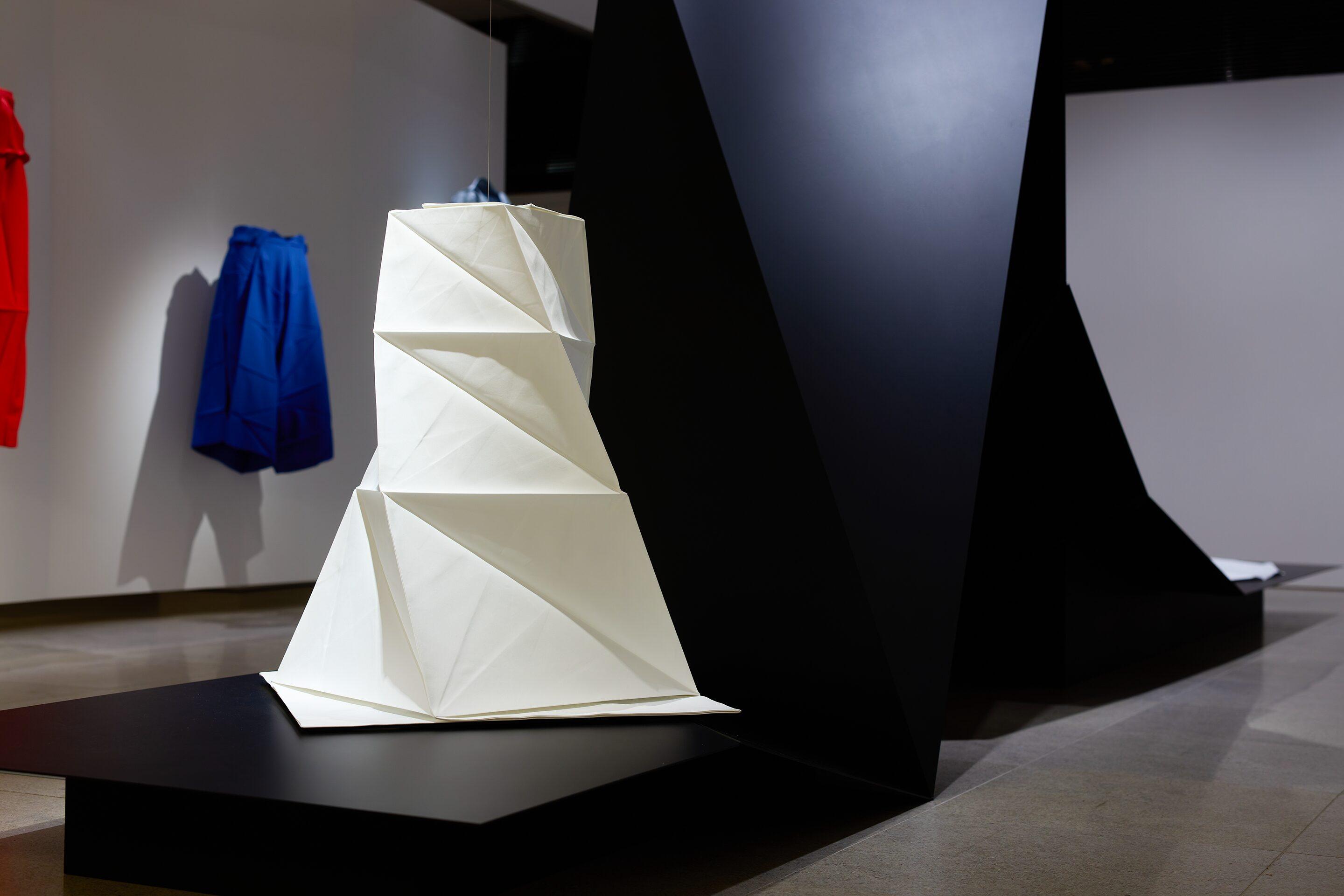 本展では、衣服の造形の根幹にある「折り構造」に焦点を当てながら、132 5.の創造のアプローチを多角的に紹介します。幾重にも折りたたまれた布の一端を持ち上げると、回転しながら立ち上がり、衣服としてかたちを成す——造形の美しさと驚きが交差するその変容のプロセスを、折りの動きを視覚化したインスタレーションとして展示しています。
